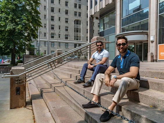 Sam and George Armoyan Jr., left to right, are seen outside the former Standard Life office tower at 1245 Sherbrooke St. W. in Montreal on Friday June 30, 2023. Photo by Dave Sidaway /Montreal Gazette